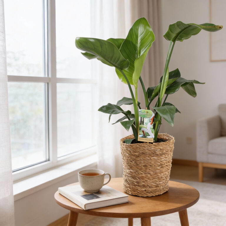Strelitzia, de paradijsvogelplant, is een spectaculaire eyecatcher met grote, waaierachtige bladeren die een tropische sfeer brengen in huis. Deze populaire kamerplant groeit snel en geeft elke ruimte een luxe, botanische uitstraling. Perfect voor wie groots durft te denken in groen.