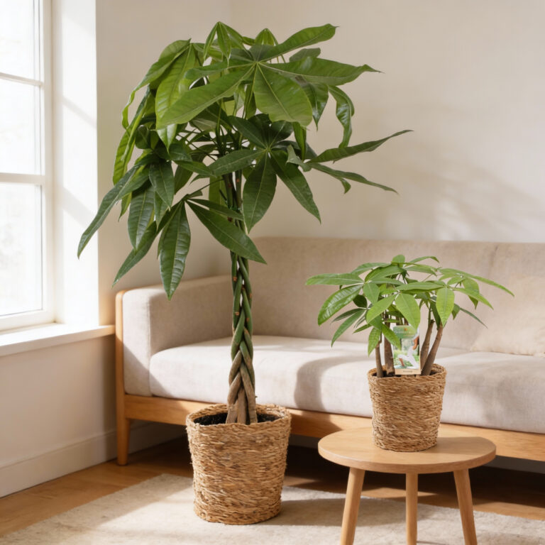Pachira, vaak geldboom genoemd, is een sierlijke kamerplant met een gevlochten stam en frisgroene bladeren. Volgens de Feng Shui-traditie zou deze plant geluk en welvaart aantrekken. De Pachira is onderhoudsvriendelijk en geeft met zijn unieke uitstraling een rustgevende, exotische sfeer aan elke ruimte.